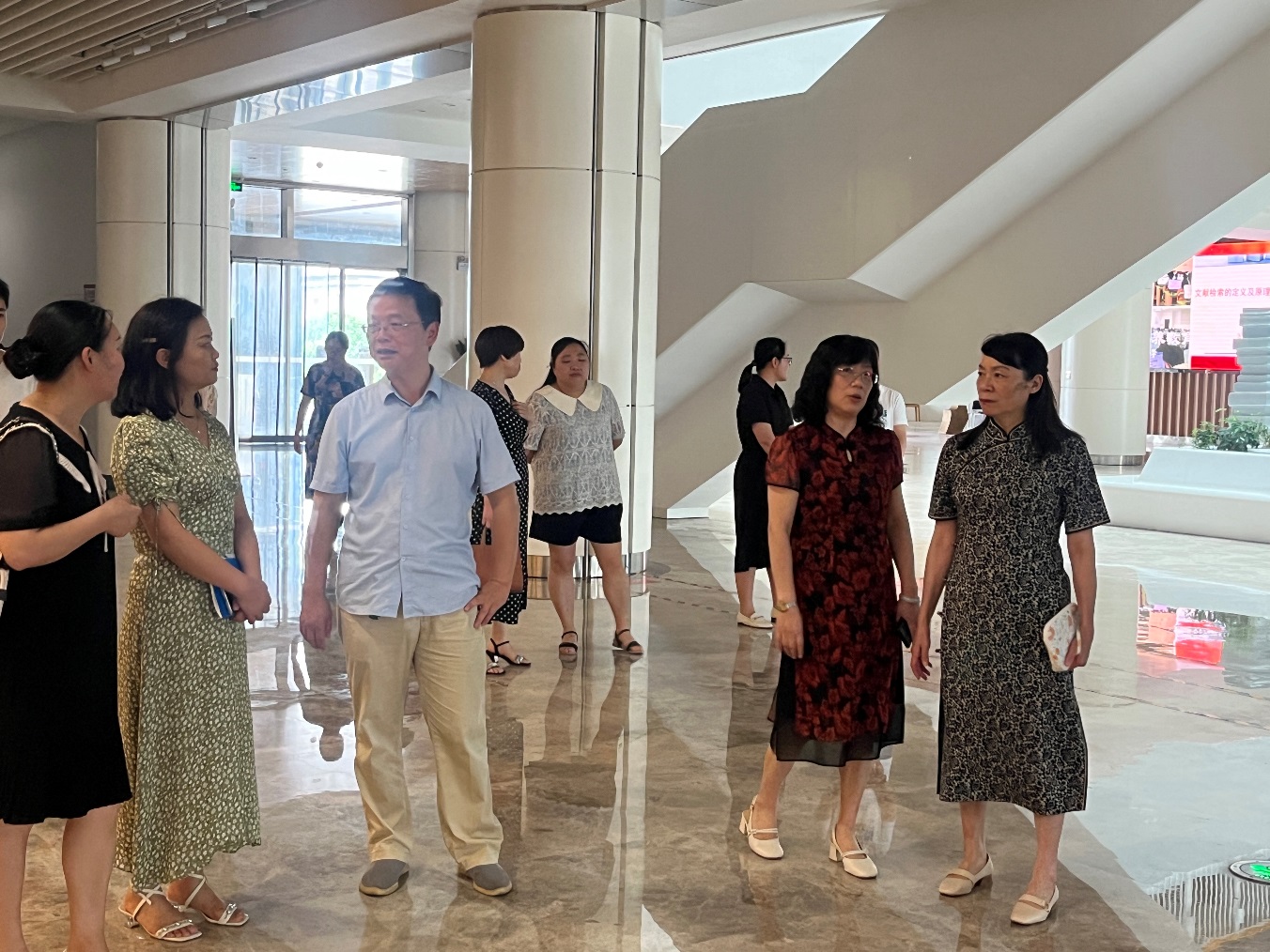 在图书馆馆长李小平、副馆长李黎等陪同下,蓝卡佳馆长一行首先参观了图书馆二楼大厅,对我馆的布局、设施、文献资源建设等情况进行了了解。