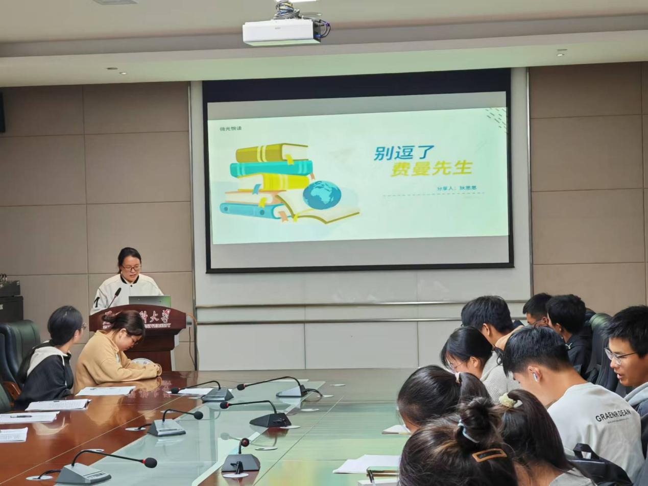 活动最后,狄思思老师分享了《别逗了,费曼先生》,讲述费曼先生在科研领域成就斐然,分享其独特科研思维与有趣方法,还提及他生活中的多彩经历,强调了科学与生活并非割裂,而是相互交融、相互促进的关系,鼓励同学们在追求科学的道路上,保持一颗充满好奇、乐观向上的心,全面发展自己。