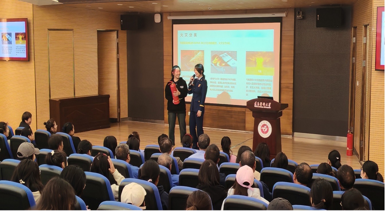 讲座围绕“火灾基本知识”“认识使用消防器材”“常见隐患和违法行为”“发生火灾时怎么办”以及“校园火灾防范措施”五个方面展开,详细介绍了燃烧三要素、火灾分类、常见火灾起因、火灾致人死亡的主要原因、常见消防标识、灭火器的分类与适用范围,并对灭火器检查和使用、消防栓和逃生面具的使用以及发生火灾如何报警、灭火的基本方法、逃生误区和注意事项进行了详细讲解。