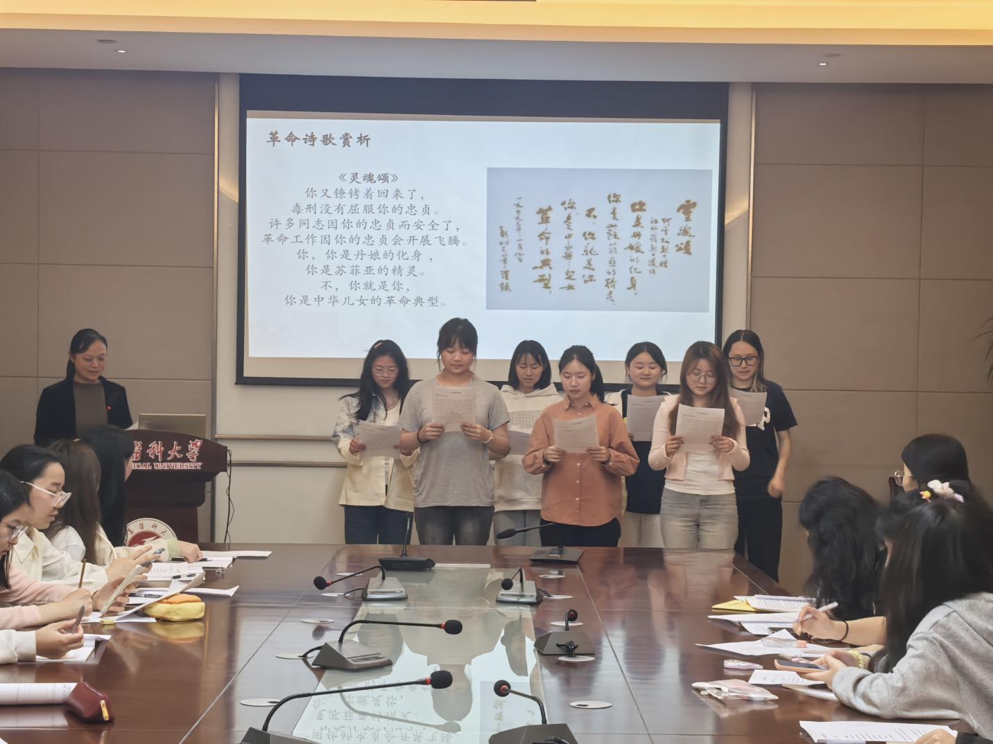 4月15日的首场活动由范良瑛老师担任主讲,以电影《烈火中永生》“绣红旗”片段拉开序幕,带领大家走进江竹筠(江姐)的革命人生。范老师结合《江姐:傲雪红梅》一书,从成长经历、地下工作、狱中斗争等维度,全面解读了江姐贫寒出身却自强不息、面对酷刑坚守信仰的感人事迹,立体呈现了她作为共产党人的钢铁意志与赤子之心。活动特别设置革命诗歌赏析与红色家书诵读环节,同学们深情朗诵狱中难友何雪松的《灵魂颂》,齐声诵读江姐临刑前的绝笔信,在字里行间感受革命先烈的精神力量。