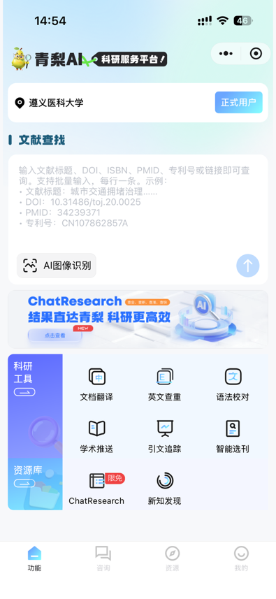 5.绑定后,打开微信搜索“青梨AI科研服务平台”小程序,登录后即可使用。