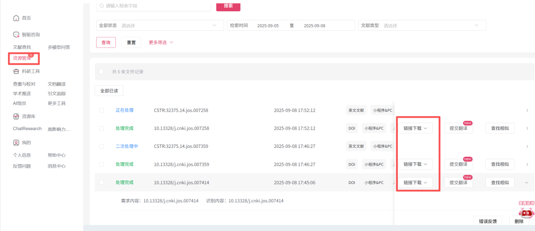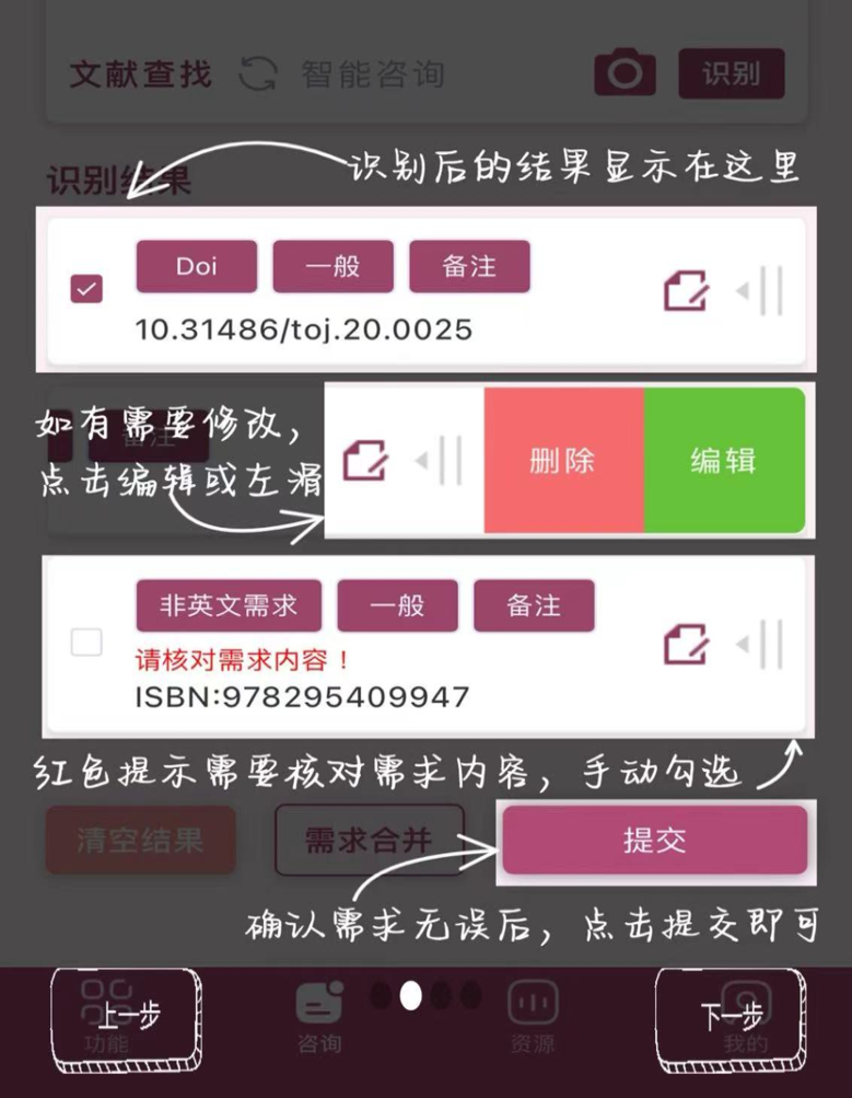 红色提示表示需要核对文献信息,请逐条确认无误;确认无误后点击 “提交”。